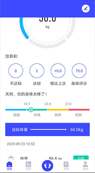 1、进入到应用页面中就可以实时看到自己最近一次上秤时的体重数据
