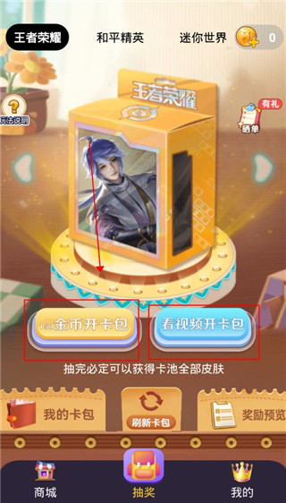 4、我们可以来到抽奖版块当中,通过看广告获得的金币或者是签到的获得的金币来抽奖,有几率抽取你想要的皮肤碎片