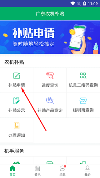 2、在首页我们就可以直接申请补贴了,同时还可以进度查询;