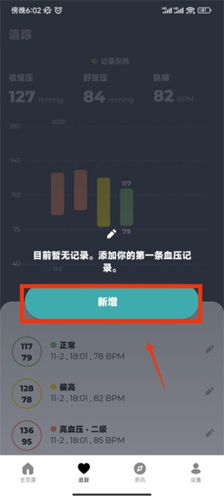 1、在血压追踪器app的追踪页面中点击新增按钮;