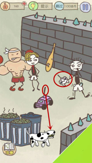 先点击史小坑的背包掉出药剂,然后将药拖到狗身上,即可过关。