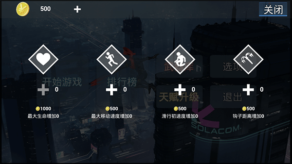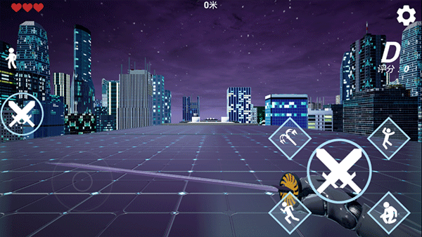 2、右侧是攻击、潜行、跳跃、极速跑等选项,上方是跑的里程数,滑动左下角轮盘开始跑酷;