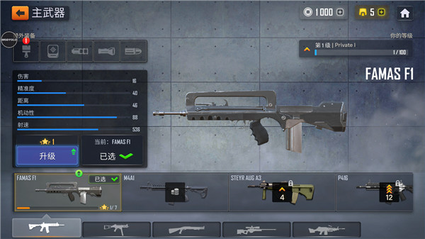3、点击左下角枪械进入枪械库为自己的各种武器增加各种的皮肤,在此同样可以看到枪械的各种熟悉,比如伤害,精准度等等,同时还支持升级枪械的各种属性