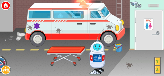4、随后将救护车拉走,打开电梯将病人送上上面去治疗,点击向往上的按键。