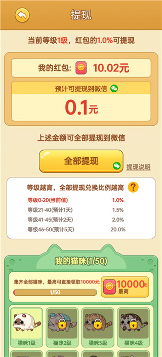 3、新用户立得0.3元提现,猫咪等级越高,可提现金额越高哦