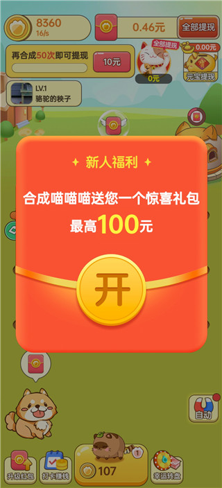 3、还有每天不断的合成猫咪提升等级也可以获得红包