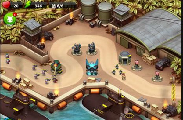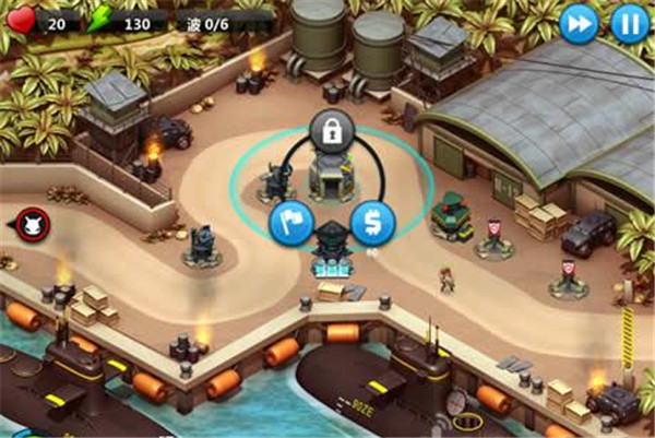 游戏的操作与传统的塔防游戏并没有太大出入,战斗中我们所安置武器的地点已经被固定了,相比一些可以自由安放防御塔的游戏要稍微局促一些,更需要玩家在开战前进行合理的防御塔布置才行。游戏中除了点击屏幕来安放防御塔之外,一些具有特殊功能的士兵或者攻击方式也需要通过点击拖动来控制,这一点给玩家带来了很不错的动手过程,让玩家们能亲自参与到战斗中来。