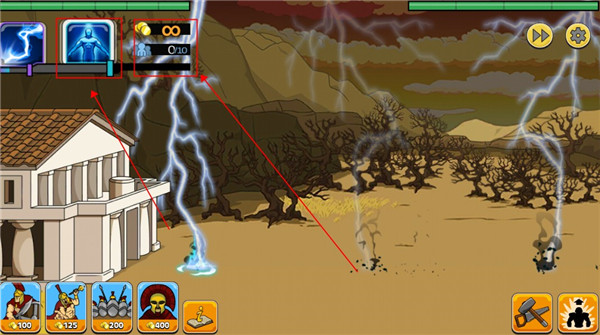 6、当敌方人数很多,聚集在一起的时候,我们可以使用左上角的魔法,释放大范围的攻击团灭对方当前兵力,趁机进攻敌方基地