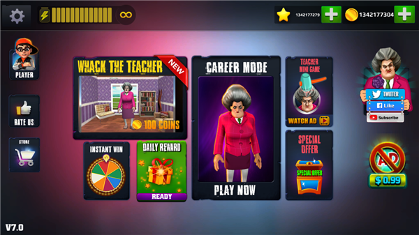 恐怖老师3D版安卓版是一款趣味冒险游戏,海量角色可以切换,多个关卡模式任你体验,超大地图可以自由探索任务,还能通过签到还是能获得一些资源奖励,各种恐怖事件会发生,你要小心被老师给抓住。游戏中玩家需要遵循丰富的主要任务来进行一系列的冒险和解密,操作还是非常简单的,通过滑杆对角色进行移动,可以使用道具对老师造成伤害,必须始终注意小窗口视频中的机关和陷阱,注意恐怖老师的攻击,也可以自由选择游戏模式来挑战,并享受游戏带来的紧张感和兴奋感。