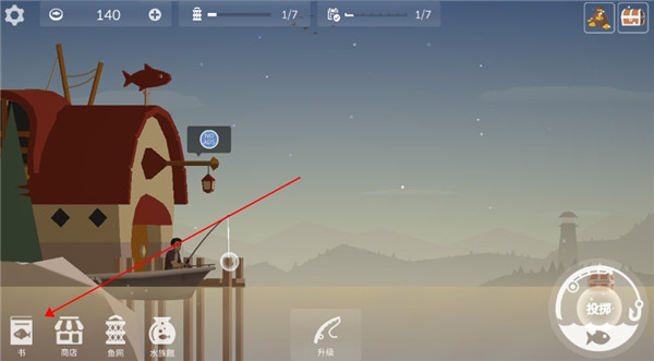 4、抓鱼。玩家点开书本标志,即可领取抓鱼任务,完后任务便可领取金币,金币可购买各种专业的渔具或是升级船只。