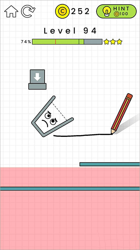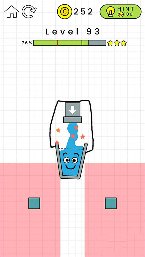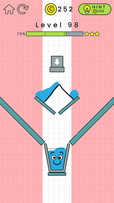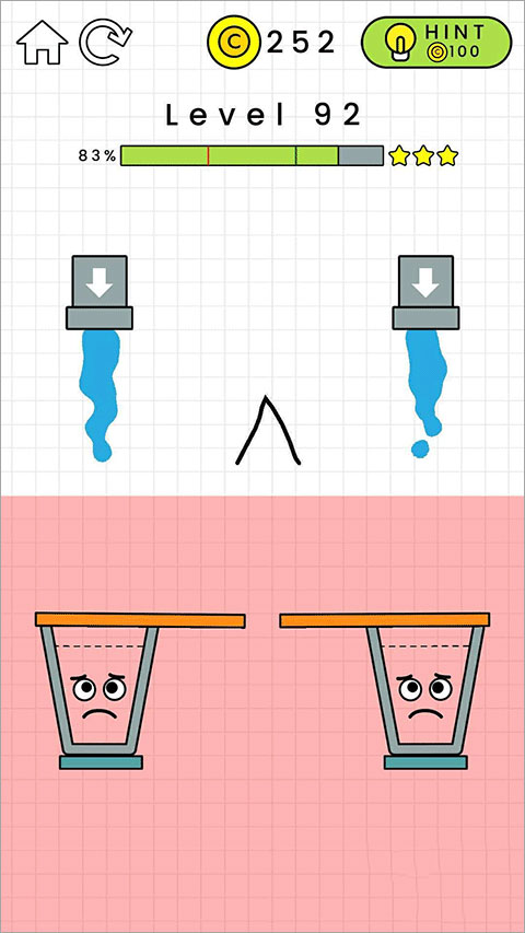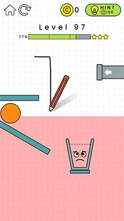 欢乐水杯游戏(Happy Glass)是一款非常火爆的休闲益智类游戏,在这里,你需要利用物理的方式,将水运送到空的玻璃杯里面,想出你自己的解决办法,所以要有创造性,不要仓促思考,是时候发挥你天马行空的创造力了。清新淡雅的卡通式画风,独具特色的题材,轻松而又不失紧张的背景音乐,在这里,玩家可以充分发挥自己的想象力,并且还可以检验你的物理知识。丰富多样的游戏关卡,拿起你的画笔,画出一条正确路线,为水珠引路到达杯子里面。另外,欢乐水杯游戏采用了自由轻松的画线模式,玩家可以根据每一关不同的地形和情况来画线,一笔画让水流进入玻璃杯中,看看你能挑战到哪里,所以大家还在等什么,感兴趣的小伙伴赶快来下载体验吧。