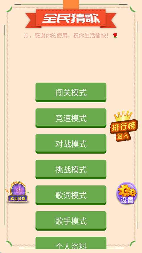 2、【闯关模式】:根据歌曲猜出歌名,每过一关奖励100金币,游戏中每隔10分钟奖励100金币,回答错误一次扣除50金币。