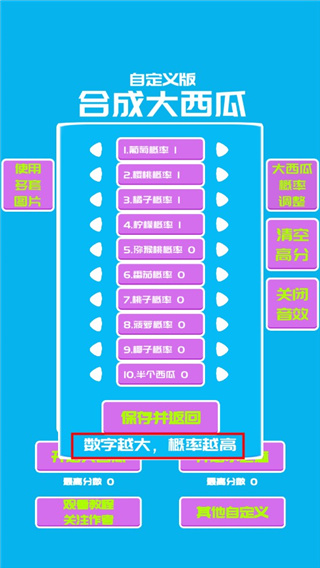 3、选择大西瓜概率调整,所有在游戏中出现的道具都可以进行调整,数字越大,概率越高;