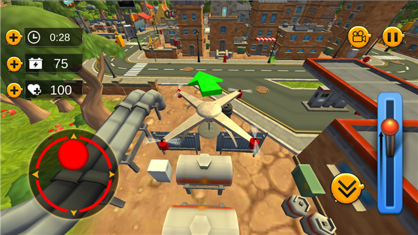 4、控制左边的方向圆盘来进行无人机的飞行,当然在飞行的过程中也要十分小心避免撞上高层建筑或其他物体;