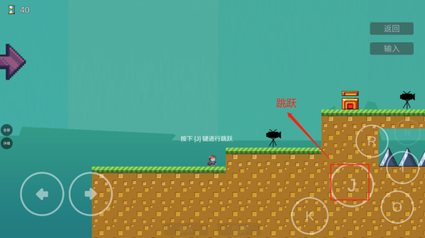 4、点击J可进行跳跃,长按可以跳的更高,点击o可查看投影,也可以在“门”的位置点击进行记录重生点。