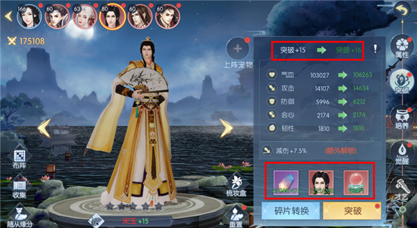 角色突破是在角色原有属性的基础上再次提升属性的功能,多次突破可以显著地提升角色的战斗能力。 单个角色前三次突破主要是提升气血、攻击、防御属性;但到了第四次突破,就可以解锁被动技能,拥有被动技能加持的角色,实战能力将大大提升;后续突破则以增加属性固定值、提升技能等级为主,使角色的力量日渐稳固积累,对获得战斗胜利也起到至关重要的作用。