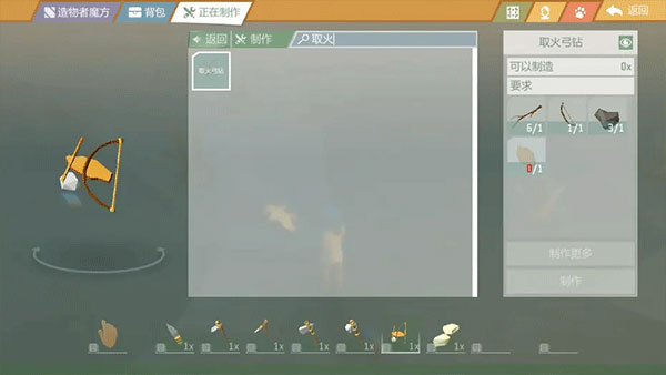制作取火弓钻,需要准备1根木棍,1个棍弓,1颗石头以及1片任意树皮。其中,木棍、石头都可以在岛屿上直接拾取得到,树皮则需要小伙伴们砍伐树木然后拾取获得。接着,棍弓需要4根木棍加1条任意绳子制作合成。最后,将上述所有材料收集完成后即可制作合成——取火弓钻。