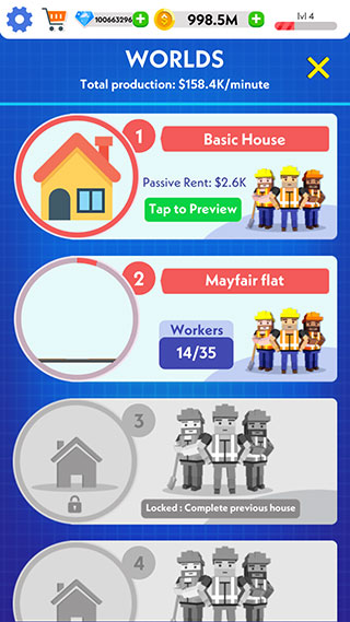 游戏里还有创造模式,可以发挥创意搭建成独特的建筑,或者堆叠色彩方块搞艺术,这点挺有趣的。不过有点小缺憾就是进展速度可能有点慢,需要耐心等待工人完成任务。建议新手多雇佣工人,升级经验和盈利设施,这样能更快赚取金币和资源。