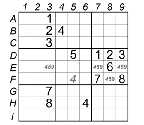 数对占位法,在上面的宫内数对占位法中,我们已经学过数对占位法,这里讲的是数对出现行列里的情况,这时的观察难度会大大增加,本技巧也属于难度较大的技巧之一。