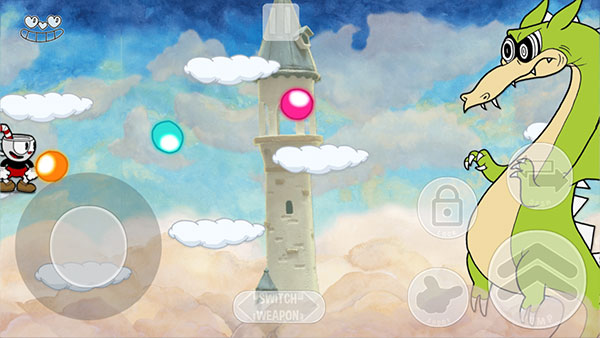 4、小编以狂暴龙关卡为例,进入后,左下角可以控制茶杯头移动,右侧分别是发射弹药、跳跃、以及快速位移技能,小心狂暴龙的火球哦。