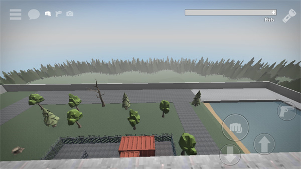 游戏玩法自由度极高,完全摒弃了繁琐的任务系统和广告干扰。点击"play"按钮即可开始冒险,在第一个地图斜坡中就能获得初始武器:一把喷子、手枪和一根棒球棒。玩家可以自由探索广阔的地图,击败各种敌人,并利用丰富的建造材料打造属于自己的世界。