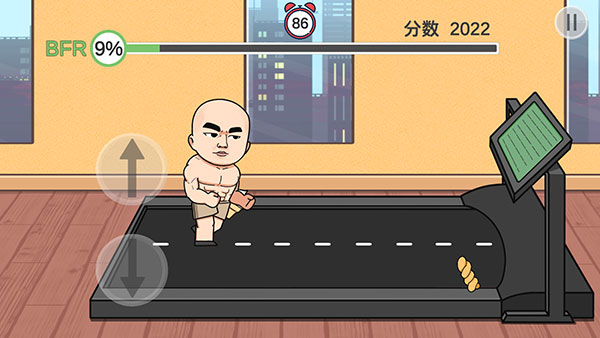 - 躲避食物:触碰到食物会增加体脂率,体脂率越高基础跑动速度越慢。通过点击左侧上箭头和下箭头按钮,可以控制角色上下躲避跑步机上的食物。