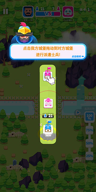 2、接着点击我方城堡拖动到对方城堡即可开始派遣士兵。