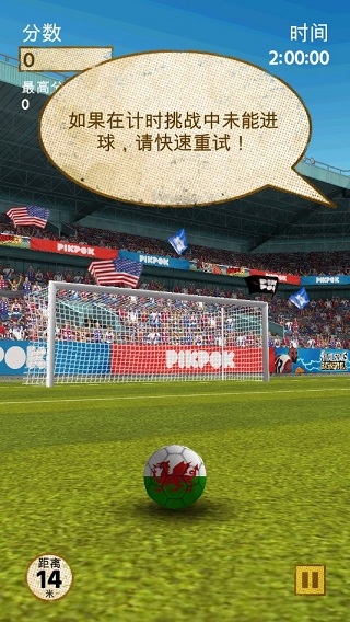 接着是“靶心”模式,在这个模式下我们有1分钟时间,只是这回的目标不是球门,而是一个个的靶子,打中靶子的中心可获得3秒钟的加时、普通击中为1秒钟、如果一个球可以打中多个靶子,也有时间和分数的加成哦。