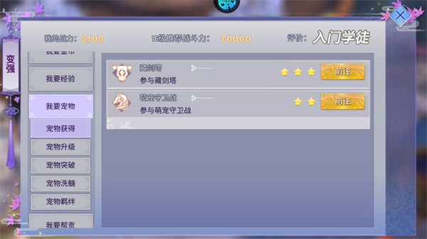 3、宠物可以通过宠物、宠物商城、藏剑塔以及萌宠守卫等方式获取,获得宠物后可以通过升级、突破、洗髓、羁绊来提升宠物战力。