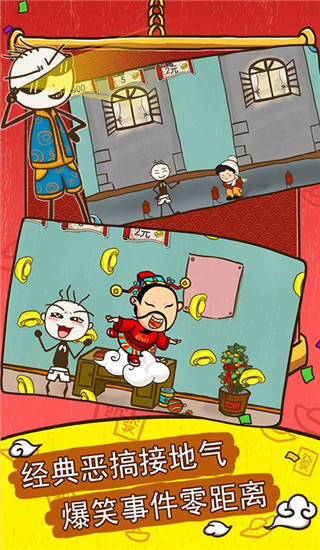 1、红红火火 甚是喜庆说起中国传统的新春佳节,大家脑海里第一个浮现的色彩会是什么呢?没错,那就是代表喜庆的大红色,本作延续了坑爹系列惯用的简笔恶搞画风,在此基础上大手笔的融入了各种喜庆元素,大面积的红色和黄色相互搭配,好一番过年景象呈现在大家眼前,就连逗趣十足的火柴人先生也很应景的穿上了唐装哟。