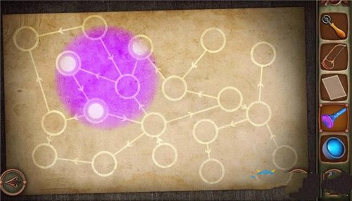13、下楼梯,点击门,将6个图形调整到之前图纸上的顺序即可,根据图纸上的箭头来,中间的圆是出发点,上图前5个是对的,将最后一个标志换成4个螺旋的圆圈标志,点击门就打开了,通关。