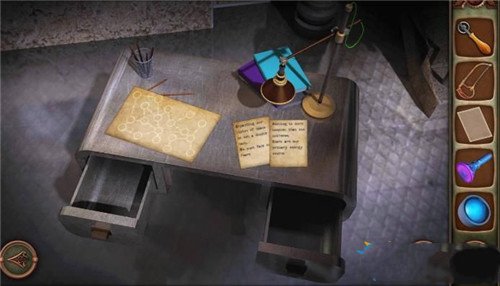 1、点击左边的楼梯(有黄色灯光的地方),我们可以看到一个手电筒,点击右边发蓝光的地方,得到一个镜头,顺便用手电筒蘸一下蓝色的液体。