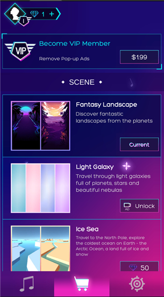 同时游戏中还为玩家内置了大量的音乐歌曲供玩家选择,不同的歌曲可是拥有不一样的音乐节奏哦,让你体验前所未有的游戏乐趣,并且还有着部分付费歌曲,这里的付费指的是钻石付费,玩家可以通过多种渠道获得钻石,如完成关卡、游戏中获取等方法,并解锁你所需要挑战的歌曲,在你挑战的过程中游戏背景不仅还会随着不同颜色的长方块进行改变,每切换一次背景都是可以让你觉得眼前一亮,让人看上去非常的舒适,游戏难度也会随之增加。