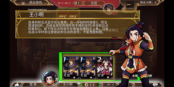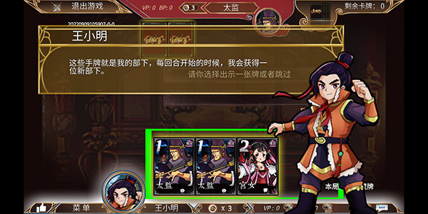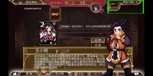 5、在一次出牌过后,我还可以再打出比上一次权位更小的卡牌。但因为我手上没有比刚刚打出的太监牌更小的牌了,所以得结束这个回合。