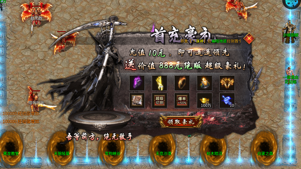 初次进入二大陆,您可能会感受到怪物有些难打,强烈建议您花点小钱开启首充豪礼(游戏内性价比最高的充值!)极品专属首饰 +高级特殊部件 +超级切割 + 攻速飙升,助您横扫所有怪物!有条件的玩家建议先提升追魂圣剑和战神形态,提升最大!核心提升人物转生!