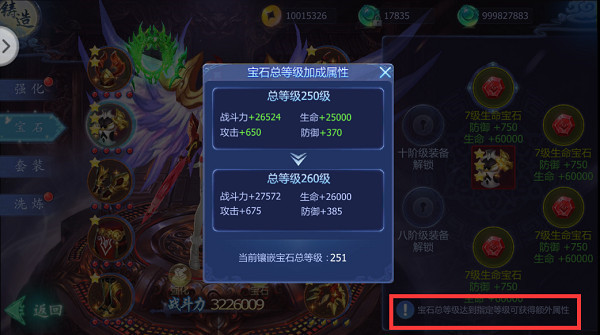 3、战力系统:宝石系统、套装系统、伙伴系统、法宝系统、神器系统、转职系统、坐骑系统、翅膀系统、境界系统、命星系统等,快速升级解锁后可以通过以上系统快速增加自身战力值