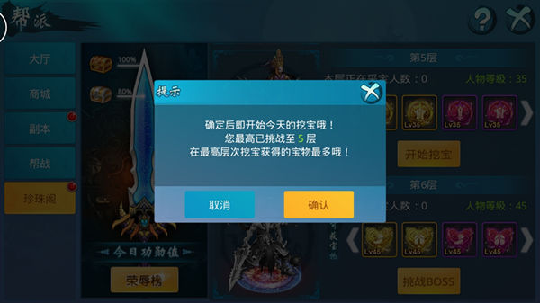 现在角色等级达到35级,并加入帮派时就开放全新帮派宝藏·珍珠阁玩法。但是玩家挑战楼层,需要一定的等级限制,没有达到等级不能挑战对应楼层的