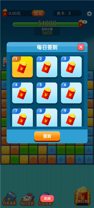 开心点点消红包版正版是由北京众时科技有限公司开发的一款消除赚钱的消消乐游戏,玩家每消除一步都可以领取相应的红包,通关更有过关红包,并且有多个提现挡位可以选择,在娱乐的同时又能获得收益,可以说是游戏赚钱两不误。游戏有海量的关卡,通关自动解锁下一关卡,越是到后面的关卡难度就越高但是能获得的红包也更多,还有每日签到也能领取各种红包,每天还有红包转盘免费转,里面有不同额度的红包免费领取。游戏里还可以接取各种任务,完成可以获得各种成就,可以领取各种游戏奖励。另一方面,开心点点消红包版正版的画面非常的精致,有各种华丽的消除特效,还有各种滑稽的声效,各种挡位的小红包领取,操作简单,只需点击相同颜色的方块即可,非常的轻松休闲,喜欢消消乐类型游戏的玩家不要错过这款游戏哦!