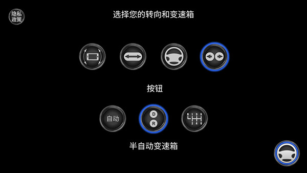 2、开始游戏前会有一个调整驾驶模式的选项,第一行可以选择陀螺仪控制转向、方向盘控制转向和按键控制转向,下方可以选择自动挂单、半自动挂挡和全手动挂挡,这边推荐新手玩家选择按键转向和半自动挂挡。