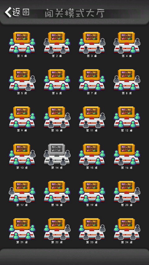 3、小编这里以“闯关模式”为例,进入后可以看到有很多有四个位置的开放房间,绿色代表玩家数,黑白色的代表是空位,你可以选择好友的房间进入。