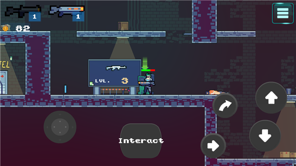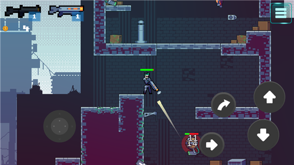 2、动态平台射击:融合了2D平台游戏和射击元素,让玩家在霓虹灯下跳跃、射击并制定策略,面对成群的敌人。