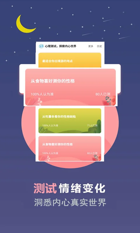 App里的功能也挺多的,比如预测情绪变化、解密内心世界、收获幸福人生和许下心愿等等。内容也很丰富,除了心理测试还有星座测试和民俗占卜,感觉像是一站式的心灵服务站。每天花五分钟测一测,生活可能会变得不一样呢!特别是“测试交友”功能,可以认识很多有相同兴趣的人,挺有意思的。