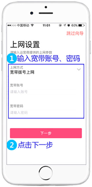 4、设置上网参数,点击“确定”后跳转到如下页面,路由器会自动检测上网方式,如果检测的上网方式为“宽带拨号上网”,请在对应设置框中输入运营商提供的宽带账号和密码,点击“下一步”。注意:76%的用户因为输错宽带账号、密码导致无法上网,请仔细检查输入的宽带账号密码是否正确,注意区分中英文输入、字母大小写、后缀是否完整等。如果不确认,请咨询宽带运营商。请根据向导提示操作,如果上网方式检测为“自动获取IP地址”直接点击“下一步”;如果检测为“固定IP地址”上网,填写对应参数后点击“下一步”。