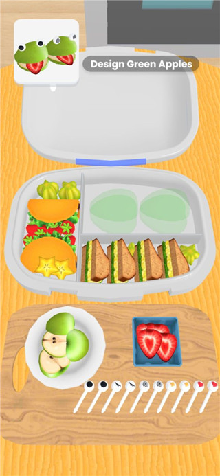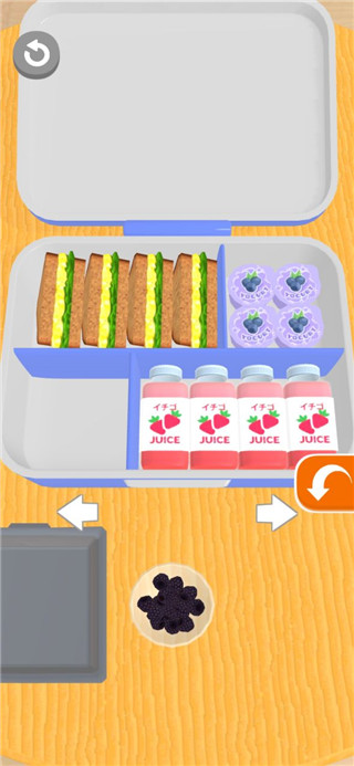 游戏玩法主要是把食材摆放到餐盒的不同位置,看起来挺简单的,而且对玩家来说很友好。虽然难度不高,但如果你喜欢整洁有序的布局,可能会花点心思规划一下。食材种类很多,有寿司、生鱼片、蛋糕、水果等等,可以自由搭配,发挥创造力。