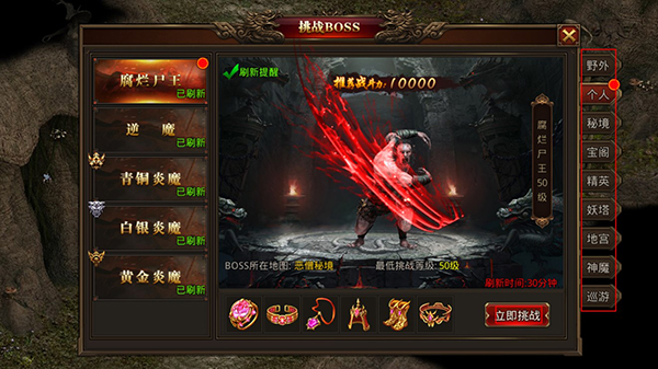 6、此外,游戏内还有野外、个人、秘境、宝阁等多种boss可以进行挑战,击败boss可以获得大量高级装备以及丰富资源道具奖励,让玩家可以快速提升战力。