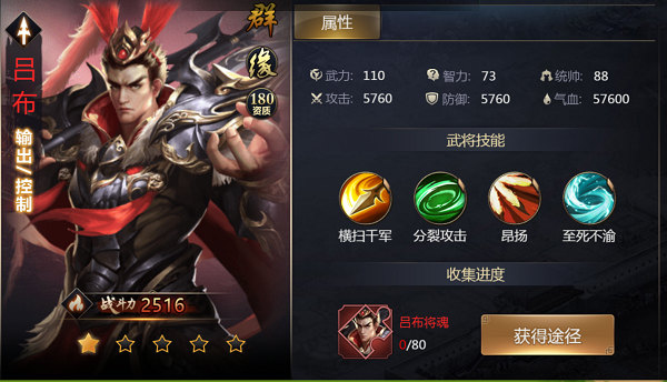 吕布属于红将,一起上阵阵容强度不用担心,但是受到攻击只能回复自身的10%生命,比较一般,12分!