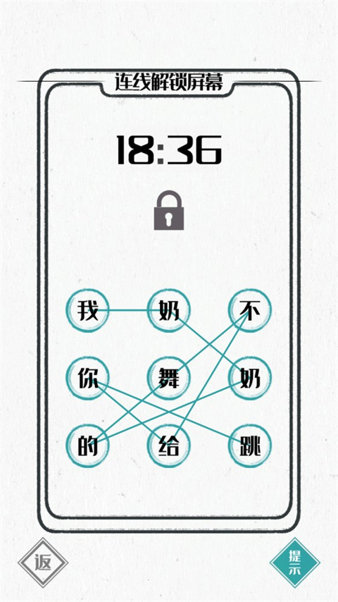 1、【解锁手机】关卡需要连线解锁屏幕,解锁密码由九个字组成,正确密码为:我奶奶的舞不给你跳,连接密码即可成功通关