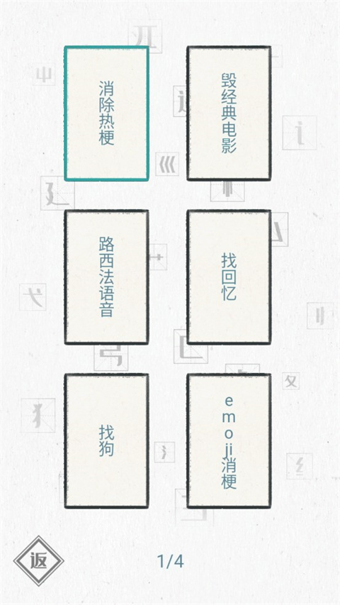 2、这里有众多关卡供玩家们体验,如:消除热梗、毁经典电影、找回忆、路西法语音、emoji消梗;找狗等等;