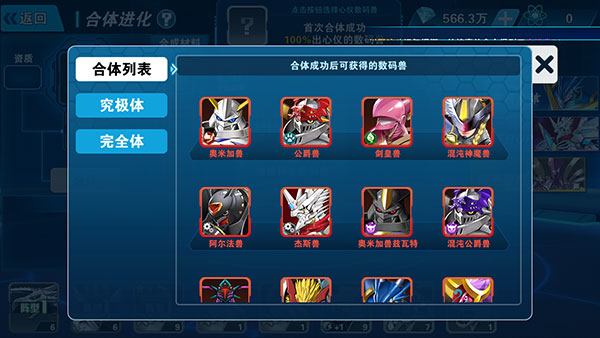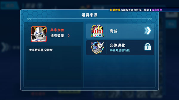 玩家等级达到10级后解锁合体进化功能,合体成功后可获得超稀有的的数码兽。