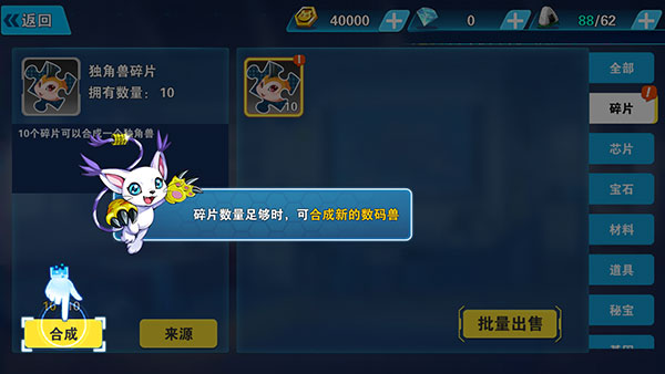 碎片数量足够时,可以在背包中将其合成为新的数码兽。